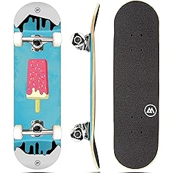 Cool Cali Vibes: Magneto's skateboard blends surf-inspired style with durable build, making it a hit for girls who skateboard and fans of ice cream-themed skateboards. Designed by skaters in California, it's perfect for young shredders everywhere Easy Cruising Fun: With a compact 27.5" x 7.75" size, this skateboard is ideal for beginner girls aged 5-8. Lightweight enough to carry anywhere, it's your go-to board for spontaneous skate sessions Trick-Ready Double Kicktails: The double kicktails on this skateboard for kids 6-8 let you master tricks like ollies and mannies. Its rad design makes it a standout for skateboards for girls aged 6-12 Quality you can Trust: Crafted from 7-ply hard maple, the deck promises durability and a solid ride for girls aged 8-12 who skateboard. The 80-grit grip tape keeps feet secure while showcasing a fun ice cream skateboard design Smooth Rollin’Ride: Outfitted with 51mm 95A wheels and ABEC-5 bearings, this skateboard for kids aged 5 ensures a smooth ride. The sturdy 5”aluminum trucks provide stability and control for both beginners and seasoned skaters