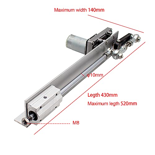 Actuador Lineal Reciprocante de Ciclo T king, Motor Telescópico Ajustable de Engranaje DC 12/24V Motor DIY con Controlador de Velocidad Carrera 3-15CM (aproximadamente 1.2-5.9 pulgadas Especificación: Nombre del producto: Actuador Lineal Reciprocante de Ciclo Tensión de entrada: AC 100-240V Tensión de trabajo: DC 12V/24V Carrera: 3-15CM (aproximadamente 1.2-5.9 pulgadas) Empuje: 2-25KG (según diferentes carreras) Velocidad máxima: 45RPM/90RPM/120RPM Tamaño de marco fijo: 350x30x60MM Peso: 1.8KG Contenido del paquete: 1 x Actuador Lineal Reciprocante de Ciclo 1 x Controlador de Velocidad
