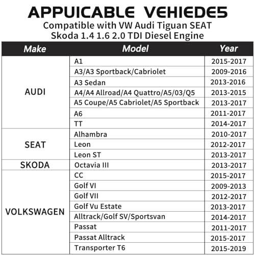 - Applicable Engine: for Audi VW 1.4/1.6/2.0TDi Common Rail (EA288) Diesel engines, Engine Code: 1.4D: CUSA; CUSB; CUTA; 1.6D: CLHA; CLHB; CLHC; CRKB; CXMA; CXXA; CXXB; DBKA; DCZA; DDYA; DDYB; DGDA; DGDB; DGTA; DGTB; DGTC; DGTD; DGTE 2.0: CHHB; DDDA;
