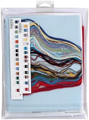 - Dimensions counted cross stitch kit for adults comes with presorted thread, wool yarn for stocking hanger, 14 count lt. blue Aida, felt, needle and instructions with an alphabet for customizing.