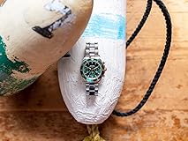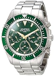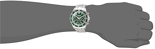 Mineral crystal lens Matte green dial with day, date and 24 hour subdials; gold-tone luminous hands and markers; printed outer minute track Silver-tone adjustable link bracelet; fold over clasp with safety Water resistant to 165 feet (50M)