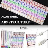 【82-key Compact Mechanical Keyboard】 This mini-mechanical keyboard features a very simplified design that reduces the size to 12.2 x 4.72 inches while preserving common buttons. Its compact size saves space. And the pluggable USB cable design, plug and play, also greatly increases its portability. This is a perfect mechanical keyboard for office or home use. 【Blue Switch】 The specially modified blue switch provides excellent touch, sensitivity and response. 50 million button tests, 60 +/- 20 grams keystroke force and 2.0 +/- 0.6 mm keystroke travel provide the purest mechanical experience. It has a strong sense of passage and a crisp sound, which is very suitable for typing work and also suitable for games. 【Rainbow mixed backlight keyboard】 Rainbow LED backlight mechanical gaming keyboard provides you with cool visual effects. It is made of high-grade ABS and metal materials, laser engraved character keys, so it is very durable. It also has 12 multimedia buttons, non-slip and splash-proof design, adjustable foot pads, and gold-plated USB cable for perfect typing angle and high quality experience. 【82 Keys Anti-ghosting】 It can allow multiple keys to work at high speed at the same time. It has a professional control chip that provides excellent durability and stable performance. Each button is controlled by an independent switch, allowing you to enjoy high-quality games that respond quickly. 【Ergonomic Design】This wired mechanical keyboard adopts R5 ergonomic button design with various button shapes. You can click the ESC and F area buttons more quickly, and the layout is high and low, which is more suitable for manual movement and reduces finger fatigue. And some common keys use a controllable design that is widened and widened to increase player comfort and provide faster button speeds.