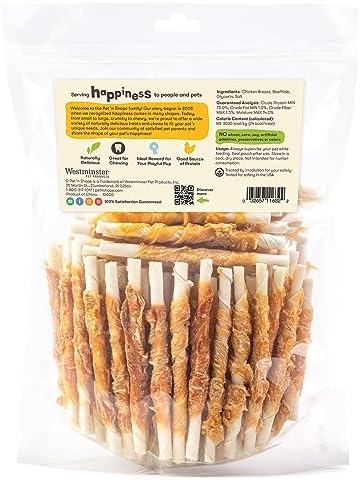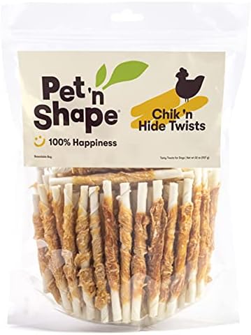 Pet 'n Shape Chik 'n Hide Twists are made from naturally delicious chicken breast wrapped delicately around a savory beefhide chew. Perfect for puppies, adults and senior dogs of all breeds. Chik 'n Hide Twists contain no artificial additives, preservatives, colors, or flavors and are free of any wheat, corn and soy. All Pet 'n Shape treats are U.S. lab tested for safety and carefully roasted to ensure optimal quality and flavor. Resealable packaging locks in freshness and is ideal for easy storage. Pawsitively Guaranteed: At Westminster Pet Products, we're committed to strengthening the bond between you and your pet, and your happiness matters. If you're not satisfied with our products, rest assured you can return them for a full refund within the specified time frame according to this site's return policies. This dog treat is the perfect stocking stuffer.