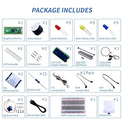 This is a basic starter kit for you to learn Embedded programming, hardware and electronic circuits smoothly and quickly in a computer. You could build your own circuit on the breadboard kit, and DIY your own micro controller project through micropython or C, C++ programming. Starter kit includes commonly used sensors, for example: LED lights, 9g servo, LCD1602 display module, resisters and buzzer, PIR sensor. Pi Pico is included:It is a micro-controller board based on the Pi RP2040 micro-controller chip. It has been designed to be a low-cost, high-performance micro-controller board with flexible digital interfaces.It features Dual-core Arm Cortex M0+ processor, flexible clock running up to 133 MHz. 264KB of SRAM, and 2MB of on-board Flash memory. Technology support: wiki.52pi.com/index.php/Raspberry_Pi_Pico_Starter_Kit_SKU:_K-0582