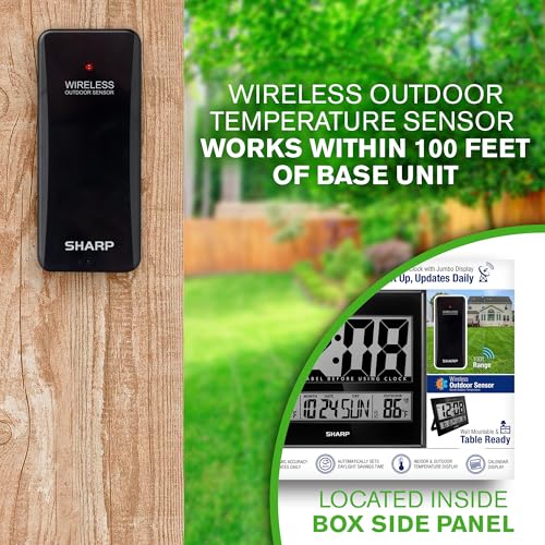 Sharp Atomic Clock - Never Needs Setting! - Jumbo 3" Easy to Read Numbers - Indoor/Outdoor Temperature Display with Wireless Outdoor Sensor - Gloss Black