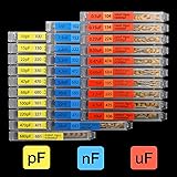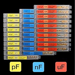 - Each value has its own Individual compartment with easy snap Lock door 30 Value Nominal Capacitance : 10pF-10uF Voltage: 50V, 10pcs per each value Yellow box 🟨 : 10pf 15pf 22pf 33pf 47pf 68pf 100pf 220pf 470pf 680pf Blue box 🟦 : 1nf 1.5nf 2.2nf 3.3nf 4.7nf 6.8nf 10nf 22nf 47nf 68nf Red box 🟥 : 0.1uf 0.15uf 0.22uf 0.33uf 0.47uf 0.68uf 1uf 2.2uf 4.7uf 10uf