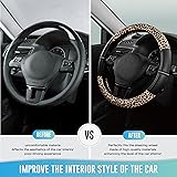 UNIQUE DESIGN - Multi-element stitching, unique leopard and rhinestone splicing, fashion and personality; flat solid interface makes it difficult to fracture, durable, and long service life. MATERIAL - Made of premium leopard pvc leather, the inner layer is made of superior rubber which provides good non-slip performance to ensure the stability of your steering wheel cover. UNIVERSAL FIT - The size 15" is universal fit for most of vehicle, high quality rubber inner ring, both to prevent the shift, and will not scratch the steering wheel, can be assured that use. POWERFUL PROTECTION - Can prevent the steering wheel of your car from cracking and fading due to sun exposure, scratching by nails and soaking in sweat. NOTE - For easy installation, you can sunlight or with a hair dryer warm up the steering wheel cover,easy install no tools required.