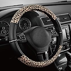 - Road Comforts We are a leading worldwide provider of auto accessories. Official licensed product provides top quality guarantee to ensure 100% customer satisfaction. FEATURES Size: 14 1/2 - 15 inches LEOPARD PVC LEATHER Size: This is a 15 inch Middle size steering cover. It fits 90% steering wheels with outside diameter of 14 1/2 to 15 inch. Hide existing wear and keep your steering wheel looking new. Waterproof car steering wheel cover. Wear-resistant durability. Protect your vehicle’s steering wheel cover from spills, stains, tears, and other damages. Money-back Guarantee - We are proud of our products and services. If you are not satisfied with our products, please return for Exchange or Refund. Any questions regarding fitment, please post in the Customer Questions & Answers section and we will endevour to respond within 24 hours.