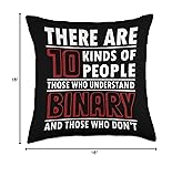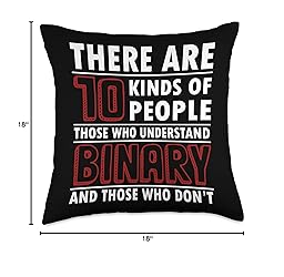 100% Polyester 10 Kinds Of People Binary Programmer Programming Coding Geek Novelty items makes a great gift for any ocassion! Great as a Christmas, Valentine's Day, Birthday or any other holiday or occasion you can think of! These items make people laugh! Programmer Novelty Geek Coding Things Inc. items make a great gift for any member of your family! 100% spun-polyester fabric Double-sided print Filled with 100% polyester and sewn closed Individually cut and sewn by hand Spot clean/dry clean only