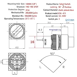 【UL Certification】 2 Position New Rotary Switch through UL certification and CE certification. Working mode: ON-OFF. 【Silver Contact】Item Name:Selector Switch,Silver Contact Type:1 Way 1NO 1NC SPDT 3Pin, ,Selector Positon: 2 Position. Rotate from left to right, it's 90 degrees. 【5Amp Current】Maximum Voltage :250V AC/DC Rated Current:5 Amp ,Action Type:Latching. 【16mm,5/8inch" 】Mounting Hole :16mm,0.63inch, Main Color:Black,Net weight: 0.02 Pound. 【Package】Package Content include:2 Pcs* 2 Position Selector Switch, 2 Pcs Wire Connector Sockets.