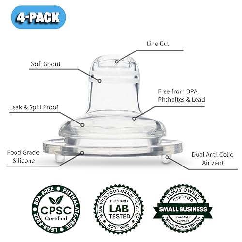 Sippy Spout Nipples for Philips Avent Anti-Colic Baby Bottles, Lansinoh, MAM & Evenflo Wide-Neck Baby Bottles, 4-Count, Soft Spout, Food Grade Silicone, Variable Flow, Spill-Proof, BPA-Free, 4+ Months