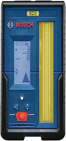 The Bosch LR20 Rotary Laser Receiver is designed to increase the GRL2000-40H and GRL2000-40HV rotary laser detection up to 1,000 feet, with a backlit LCD display for use in darker areas or outdoors. The display illuminated large, easy-to-see indicators, including up/down arrows, center line, accuracy level, battery level and audio signal. It also has dual-sided indicators, to provide easy visual readout on both sides of the receiver. The oversized laser detection area helps find the laser beam faster, making it easier to start setting level. The receiver provides convenience features such as built-in magnets for secure attachment to metal surfaces, an adjustable audio indicator, intuitive four-button keypad, receiver vial and ergonomic soft grip.