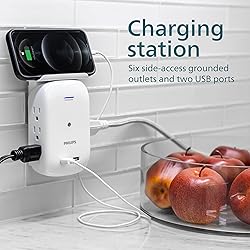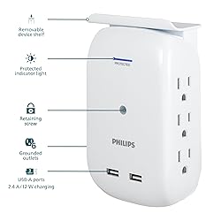 - Fully equip your outlets with the set of two Philips Surge Protector Wall Taps with USB. Featuring six grounded three-prong outlets with 450 Joules of surge protection, the surge protector transforms your regular outlet into a versatile and efficient power station. Two USB charging ports supply 2.4A of power for smartphones, tablets or other mobile devices. Set your phone on the removable device shelf while it charges – or remove the shelf for a slim, sophisticated look. A built-in protected indicator light shows that the surge protection is active and your connected devices are safeguarded from harmful voltage spikes. Just plug the surge protector into a standard grounding duplex wall receptacle and you're ready to go. If you wish to install your outlet tap permanently, simply use the included mounting screw to quickly connect your surge protector to your receptacle. Whether it's your home office, entertainment center or workspace, get the most from your outlet with a Philips Surge Protector Wall Tap with USB.