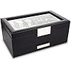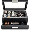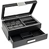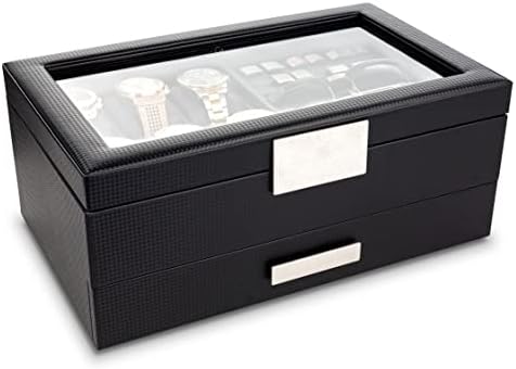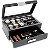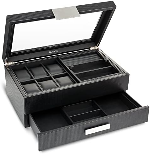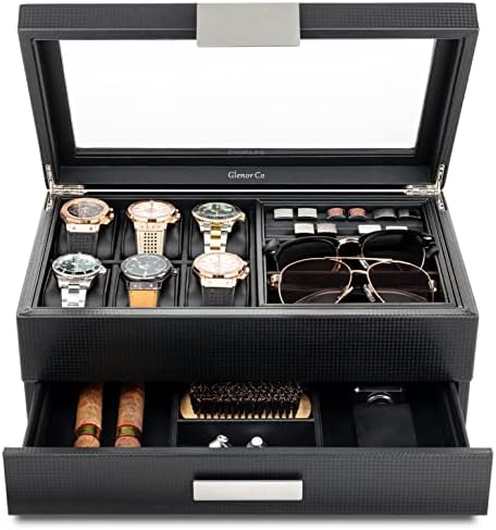 Valet Jewelry Box for Men - Holds 6 Watches, 12 cufflinks, 2 Sunglasses, Drawer & Tray Storage - Watch Case - Carbon Fiber design Organizer w Metal Accents & Large Glass Lid - Black