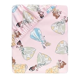 Microfiber Soft pastel pink fitted crib sheet features officially licensed Disney Princesses Belle in her yellow gown, Tiana in her green gown, and Cinderella in her blue gown Each Disney princess is holding a small bouquet of flowers Soft microfiber material creates the perfect sleeping surface for baby Highly durable and machine washable for easy care