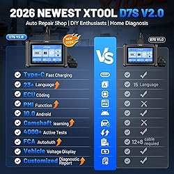 2026 Upgraded Ver. of the XTOOL D7: XTOOL D7S obd2 scanner diagnostic tool has all-around upgraded: Upgraded Hardware: 2+64GB, rear camera, intuitive interface, foldable kickstand, Android 10 and large-capacity battery 2500mAh 7.3V (equivalent to 5000mAh 3.7V). With support for FCA Autoauth, CAN FD & DoIP Protocol, it performs OE-level full-system diagnostics, 4K+ active tests, and 39+ reset services. Advanced functions include ECU c0ding for BMW/Benz and PMI for Ford, Lincoln, and Mazda. It also supports data export, 8-PID graphing, upgraded V2.0 diagnostic report and 23+ languages. It covers 10,000+ Coverage, includes 3 years of free updates, and works with the XV200 endoscope. [𝐎𝐄-𝐋evel 𝐅ull-𝐒ystem 𝐃iagnostics & 𝐂overage for 𝟏𝟎,𝟎𝟎𝟎+ 𝐕ehicles] XTOOL D7S V.2.0 scanner for car provide dealer-level full system scanning, read & clear DTCs, read ECU Info, retrieve Freeze Frame, monitor Live Data, active tests and full obd2 functions. Supporting over 150 brands and 10,000+ models globally (US, EU, Asia, and Australia), the D7S V.2.0 car scanner is compatible with CAN FD for GM, for Cadillac, for Buick(MY2020+) and DoIP for BMW(E/F/G Chassis), for Land Rover, for Jaguar. It overcomes FCA vehicle gateway restrictions (Jeep, Dodge2018+, Chrysler, Fiat 2017+). 𝐍𝐎𝐓𝐄: Contact us to verify compatibility before purchasing. [𝟒𝟎𝟎𝟎+ 𝐁i-𝐃irectional 𝐂ontrol for 𝐏recise 𝐀ctive 𝐓esting] XTOOL D7S car scanner diagnostic tool with bidirectional control function allows you to perform over 4000 active tests, such as fuel injectors, ABS pumps, valve, wipers, A/C clutch, fuel pump, cooling fan testing, enabling quick component status verification. This minimizes repeated disassembly, improving repair efficiency. [𝟑9+ 𝐒pecial 𝐒ervices & 𝐂omprehensive 𝐄𝐂𝐔 𝐂0ding 𝐒olutions] XTOOL D7S full system car diagnostic scanner offers 39 maintenance Resets Adaptations Relearns Calibrations functions like Crank Sensor Relearn, Oil Reset, EPB, SAS, BMS, Throttle, Injector C0ding, ABS Bleed, TPMS Reset, Power Balance, it supports online & offline ECU c0ding for BMW/Benz, and PMI function for Ford, Lincoln, and Mazda. This covers both vehicle performance optimization and module replacement needs for Father, technicians and DIY enthusiasts. 𝐓ip: Compatibility varies by cars, please contact us to check compatibility first. [𝟖 𝐋ive 𝐃ata 𝐆raphs & 𝐀uto 𝐒can 𝐀uto 𝐕𝐈𝐍] XTOOL newly 2026 D7S bidirectional scan tool simultaneously display 8 dynamic PID data streams in graphical form (supports CSV export, playback and recording). The new XTOOL Scanner D7s report template allows customization with logos and client details. AutoVIN can identify your vehicle's make, model, and year information with just one click, AutoScan automatically scans all of the vehicle's ECUs and detects any fault codes. Compared to other code readers & scan tools, aiding in precise analysis and enhancing service professionalism. [𝟑 𝐘ears 𝐅ree 𝐔pdates & 𝐆lobal 𝟐3+ 𝐌ulti-𝐋anguage 𝐒upport] You can enjoy XTOOL Upgraded D7S OBD-II Scanner 3 years of free software updates (valued at $300), ensuring continuous compatibility with new vehicle protocols and functions. Built-in support for 23+ languages (including Chinese, English, Spanish, etc.), with no IP restrictions, making it suitable for users worldwide. If you need a language upgrade, please provide the device S/N code and contact us. [𝐏rofessional-𝐆rade 𝐅eatures at an 𝐄ntry-𝐋evel 𝐏rice] XTOOL D7S Auto Scanner offering high diagnostic capabilities equivalent to $500-level tools, XTOOL D7S V.2.0 bidirectional obd2 scanner integrates 39+ special services, full system scanning, 4k+ bi-directional control, ECU c0ding, PMI functio and FCA AutoAuth/CAN FD/DoIP, It meets the needs of both repair shops and DIY users, significantly reducing equipment investment costs. We are available 24/7/365 to support you and offer the following: 30-day return, 24-month brand warranty, 36-month free updates, lifetime technical support.