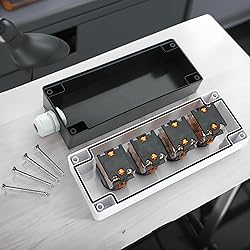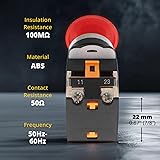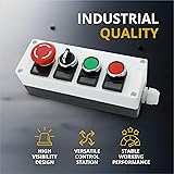 Durable Control Switch Box for Industrial Use – This robust panel-mounted enclosure features 4 pre-drilled 22mm holes and includes: two (2) momentary flat head pushbuttons (red and green), one (1) 2-position maintained selector rotary switch, and one (1) stay-put mushroom head emergency pushbutton. Built with flame-retardant, impact-resistant, and water-resistant materials for long-lasting, safe use in industrial settings Easy to Install and Wire – The included switches and push buttons feature clear NO/NC contact labeling and screw terminals for quick connection. Perfect for automation, machine control, and emergency systems in industrial, residential, and marine setups Momentary switch Specifications – Models XB2-BA31 (green) and XB2-BA42 (red). Spring return action, 22mm mounting, 50Hz-60Hz, AC 415V. Dimensions: 75 x 35 mm. Constructed with durable plastic housing for frequent use in control systems Rotary Switch Specifications – Model XB2-BD25 (Electric NO NC Latching), 2-position maintained selector switch with NO/NC contacts. Rated at 220VAC and 10A. Panel-mount style with IP55 protection, CE/CCC certified. Designed for up to 50,000 operations in harsh industrial environments Emergency Button Specifications – Model LA38-11ZS with latching stay-put mechanism. 22mm mount, 250VAC 3A SPDT NO/NC. Constructed with ABS housing, rated for AC 380V and DC 220V. High resistance to shock (200g) and vibration (15g)
