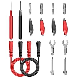Multimeter test leads are made of high quality copper material which are soft and flexible. Both ends are threaded female sockets, which can be used with accessories flexibly. Leads: CAT III 1000V,10A. Length: 3.3ft/1m. Replaceable multimeter test probes, alligator clips, banana plugs and spade plugs can be used in different measurement environments such as industrial, electronics, home and automotive. Multimeter leads are designed for most multimeters, clamp meter and other test instruments. Replaceable probes, alligator clips banana plugs and spade plugs can help expand testing capability and flexibility. Package include: 2PCS test leads, 2PCS test handles, 4PCS alligator clips, 2PCS replaceable probes, 4PCS replaceable banana plugs, 2PCS replaceable spade plugs. Hope you can be satisfied with our products. We will always provide friendly customer service.