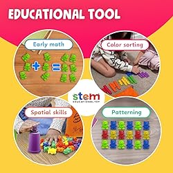 SCHOOL READINESS: The tumbling counting bears for toddlers can be used to learn colors, sort, and stack. Preschoolers can use these teddy bear counters for EARLY STEM ACTIVITIES to learn basic math skills including graphing, addition, subtraction, skip counting, nonstandard measurements, one-to-one correspondence, counting to 60, comparison, making 10, sequencing, matching, patterning and grouping. Skoolzy STEM toys for 6-8-year-old boys and girls deliver engaging, high-quality educational fun that kids will love. Designed to spark curiosity and creativity, our toys offer a great blend of learning and play, ensuring an enriching experience for every child. SCHOOL READINESS: The tumbling counting bears for toddlers can be used to learn colors, sort, and stack. Preschoolers can use these teddy bear counters for EARLY STEM ACTIVITIES to learn basic math skills including graphing, addition, subtraction, skip counting, nonstandard measurements, one-to-one correspondence, counting to 60, comparison, making 10, sequencing, matching, patterning and grouping. FINE MOTOR SKILLS TOY FOR PRESCHOOLERS: Use the visual & tactile teaching activities such as stacking, sorting, tipping and pouring to encourage your little one to move their hands carefully as the bear chips can tumble. Promotes fine motor development including hand-eye coordination, manual dexterity and motor planning, all while enjoying a fun and interactive game. EDUCATIONAL: This brightly colored 1-inch Montessori math counters bear toy makes LEARNING FUN: the set comes with 60 rainbow bears in 6 different colors with 6 matching cups, colored tongs and a dice for math toddler games. Use the color sorting toys for fun learning activities for 2 year olds and for toddler color learning. The grasping movement and pincer grip when using the tongs to pick up and drop the bears into the cups will strengthen the small hand muscles needed later for writing.