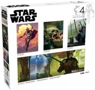 This 4-in-1 Star Wars jigsaw puzzle multipack includes unique artwork from the Lucasfilm series, The MandalorianTM on Disney+. The pack include three 300 piece puzzles and one 500 piece panoramic puzzle. The Mandalorian, GroguTM, and Ahsoka TanoTM make appearances in these puzzles inspired by scenes from the show. Every Buffalo Games jigsaw puzzle is manufactured from recycled puzzle board. A precision cutting technique guarantees that every piece will fit soundly with the company's signature Perfect SnapTM. A bonus puzzle poster is also included so that you have a handy reference of what the completed puzzle should look like while you put yours together. © & TM Lucasfilm Ltd. starwars.com