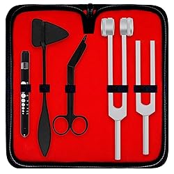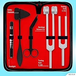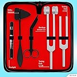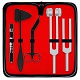 - DEXSUR Diagnostics Kit - Percussion Taylor Reflex Hammer + C 128 & C 512 Tuning Forks + Bandage Scissors + Pupil Gauge Pen Light in Carrying Case - 6 Pieces Set - Black & Silver