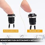 Specifications: 12mm Momentary push button switch without Led(5PCS). How to use: The button switch operation type of this product is Momentary, keep pressing and holding the button = ON, hand off the button = OFF). Mounting hole size: 0.5"/12mm, please check the size carefully before purchasing. This switch can be used for: cars, ships, trucks, homes, coffee machines, industrial equipment, medical equipment, etc. Waterproof: As the product has IP65 Waterproof, it is very suitable for use in marine applications such as ships.