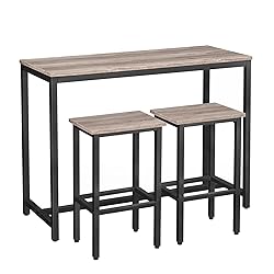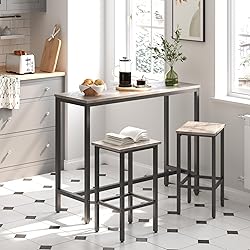 Particleboard Simplistic Set for Any Occasion: A bar height table and 2 bar stools with high-end wood grains - a great combination of industrial look and modern appeal. It will be a wonderful spot where you enjoy breakfast with family or do projects, there is nothing better An Unbeatable Experience: Pub Table: 47.2'' L x 19.7'' W x 35.4'' H, Stool: 15.7'' L x 11.8'' W x 25.6'' H. Great for holding drinks and food as dining table. The great height allows to completely relax the body and allow the stools slide right under the table Quite A Personality: The individualized and eye-catching idea makes the kitchen table and stools set never out of date and complements well with the existing furniture or color scheme Believe In Its Solidity: Our high top table is composed of quality E1 chipboard as well a robust black metal structure, which makes this piece of furniture has excellent durability and holds up to 265 lb Easy to Assemble: Not only thanks to the simple structure of this bar table set, but with clear instructions and required tools, you don't have to spend an afternoon to assemble