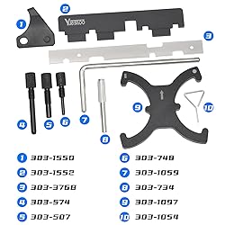 - Yuesstloo Engine Camshaft Belt Timing Locking Tool Kit is used to lock the camshafts and accurately position, align hold your engine at TDC to perform service when the engine needs to be removed and timed. Package List & Respective OEM Numbers:1- Timing Belt Tensioner 303-10542- Flywheel Timing Pin 303-10593- Crankshaft Timing Pin 303-7484- Camshaft Sprocket Timing Pin 303-7355- Crankshaft Timing Pin 303-6206- Camshaft Positioning Plate 303-3767- Camshaft Setting Bar 303-15528- Crankshaft Shock Absorber 303-15509- Camshaft Sprocket Locking Tool 303-109710- Carrying Case - Convenient to store and transport11- A Pair of Gloves - Worn when you using this toolAll parts are made of premium corrosion-resistant materials, coated with black anti-oxidation layer, anti-rust, strong, high hardness.Fit Vehicles:Compatible with most 1993-2020 Ford 1.5L 1.6L engines, works for Focus Fiesta Fusion VCT Ecoboost C-MAX Escape Galaxy Kuga Mondeo S-MAX Tourneo Connect, for Transit Connect, for Transit Courier, for Mazada MPV, for Mazda Tribute and for 1977 to 1986 Ford Transits.