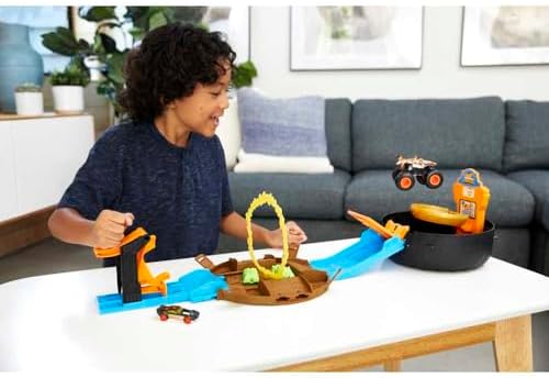 - El playset Hot Wheels Monster Trucks Stunt Tire es impresionante abierto o cerrado. El neumático sobredimensionado del camión monstruo contiene una pista de acrobacias que mide más de 35 pulgadas de largo e incluye un asa para portabilidad cuando está cerrado.