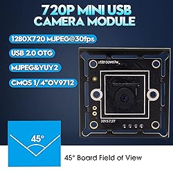 1 Megapixel USB camera module comes equipped with a 1/4" CMOS OV9712 image sensor for improved image performance. Its super small profile and thin configuration make it ideal for embedded applications. The USB 2.0 camera module comes with a 1-meter USB 2.0 cable. Board size/weight is 32X32mm (compatible with 26X26mm)/approx. 30g. M7 Lens 45 Degree Mini USB Camera: 1MP USB Camera Module with Ominivision CMOS 1/4" OV9712 Image Sensor. Standard M7 Mini Lens with a wide-angle view (D)60 (H)45 degrees. The 720p USB camera module comes with IR-cut filter@550nm for true-color images/videos (does not work with 850nm infrared illumination). Brightness, contrast, color saturation, sharpness, gamma, WB, and more are adjustable. The ultra-small profile and thin shape make the compact camera suitable for various application scenarios such as traffic monitoring, parking lots, entrance of parking lots, ATM machines, toll booths, etc. Operating System Support: The USB camera module is an ideal choice for many applications such as security systems, portable video systems, video phones, industrial machine monitoring, and toys. It supports USB 2.0 plug-and-play free drivers. Most operating systems: Win7/8/10, Linux, Mac OS, Android, Raspberry Pi, etc. Wide Application: The USB 720P camera module is an ideal choice for many applications such as security systems, portable video systems, video phones, industrial machine monitoring, and toys. It uses high-quality image sensors manufactured by OmniVision, which is one of the world leaders in the electronic field. The USB camera module is the ideal choice for device manufacturers, experimenters and hobbyists.