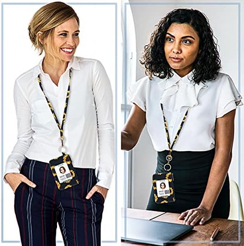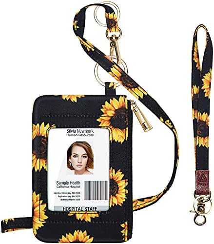ID Badge Holder with Lanyard, Fashion Lanyards Wallet with 1 Clear ID Window, Credit Cards Coins Cash Pouch with a Detachable Neck Lanyard and a Wrist Lanyard (Sun Flower Pattern)
