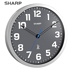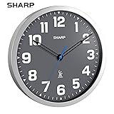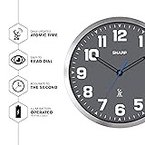 Sharp Atomic Analog Wall Clock - 12" Grey Face, Silver Brushed Finish - Sets Automatically- Battery Operated - Easy to Read - Easy to Use – Modern Design and Style