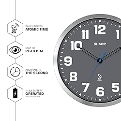- Keep track of time with the utmost precision with this attractive atomic analog wall clock from Sharp! Remove the yearly hassle of changing your clock for daylight saving time with the Sharp 12 in. atomic wall clock. Its features include Self-setting time based on your desired time zone, an attractive Grey Face, white Numbers, black hour and minute hands, with a blue sweep second hand. Completing the look is a silver brushed frame and large numbers for easy viewing. The unit requires 1 AA battery. By radio communication with its built-in antenna, the clock regularly updates the hour, minute, and second of the day for continued accuracy from its source, the United States Atomic Clock in Boulder, Colorado. Additionally, the clock adjusts automatically for daylight savings time in the spring and fall.