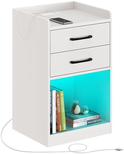 Seventable Nightstand with Charging Station and LED Lights, Modern Night Stand with 2 Drawers and Storage Open Compartment for Bedroom, White