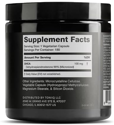 Suplemento Toniiq Ultra Alta Fuerza DHEA 100mg para Hombres - Suplemento DHEA Microinizado de Alta Pureza y Biodisponibilidad al 99%+ para Mujeres y Hombres - DHEA 100 mg - 180 Cápsulas