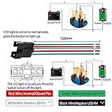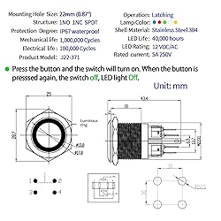 - Package include : 2* Push Button Switch 2* Wire Connector Sockets What's Latching Switch: Latching switch: Push it, ON; Push it again, OFF. What's the Wire Connector: With the wire connector, you don't need to solder the terminals, make installing very easy Saves the issue of soldering to the switch, and possibly melting it as well You can replace the switch anytime by just unplugging the switch from its socket Wide Application: Our switch can be used as a switch for various additional electric equipment, inside and outside the car. AC or DC enviroment. It is widely used to control LEDs and circuits on Car, RV, Marine Boats, Trucks, Households, Coffee Machine, Industrial Equipment and Medical Equipment. Suitable for almost any motorized vehicle of motor starting, power starting devices, and can also be an access control button. What's Note: -These switches come with a rubber O-ring which makes them splash resistant but they can NOT be submerged underwater -The project you are going to be used for, don't let current go above 5 amps. Or the switch will get warm and to be burned out What's Customer Support: If you have any questions, feel free to contact us by E-mail any time. We get professional customer service staff and technician to help you Specifications: Head diameter: 0.98" (25mm) Mounting hole size: 0.87" (22mm) Switch combination: 1NO1NC SPDT Switch rating: 5A/250VAC, 5A/30VDC LED rating: 15mA, Using AC/DC LED lamp, the terminals have no difference of anode and cathode Head shape: Flat Enclosure material: 304 Stainless Steel Protection level: IP67, IK10 There are 6 wires in the electrical socket plug, 2 Red Wire: Normal Closed Pin ="NC", 2 Green Wire: Normal Open Pin ="NO", 1 White Wire: Positive LED Pin “-”, 1 Black Wire:Negatve LED Pin “+”