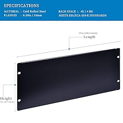 Contents: 4U blank panel x2, M6 screws x12, M6 plastic washers x12, M6 cage nuts x12 Dimensions: 7 in H x 19 in W x 0.39 in D Designed to cover empty spaces, maintain proper airflow and keep dust out of your rack Constructed from high quality cold rolled steel with a durable black electro-static powder coated finish EIA/ECA-310 compatible; Fits standard 19-inch server racks, enclosures and cabinets