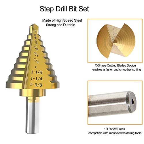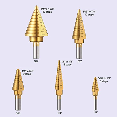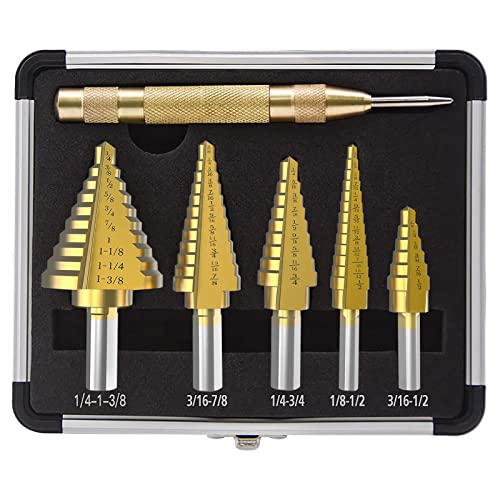 The step drill bit are made of high speed steel, strong and durable. X-shape cutting blades design enables a faster and smoother cutting. 1/4 "or 3/8" rods are compatible with most electric drilling tools, suitable for Home DIY, and General Building/Engineering Use. fit for drilling holes in stainless steel sheet, aluminum alloy, plastic material and wood(the board must be smaller in thickness than the height of step drill bits, thickness not exceed 0.12 inch/3mm). Step Drill Bit Size: #1: 1/4" to 1-3/8" 10 steps (1/4'', 3/8", 1/2", 5/8", 3/4", 7/8", 1", 1-1/8", 1-1/4", 1-3/8") #2: 3/16" to 7/8" 12 steps (3/16'', 1/4", 5/16", 3/8", 7/16", 1/2", 9/16", 5/8", 11/16", 3/4", 13/16", 7/8") #3: 1/4" to 3/4'' 9 steps (1/4'', 5/16", 3/8", 7/16", 1/2", 9/16", 5/8", 11/16", 3/4") #4: 1/8" to 1/2" 13 steps (1/8", 5/32", 3/16'', 7/32", 1/4'', 9/32", 5/16", 11/32", 3/8'', 13/32", 7/16'', 15/32", 1/2'') #5: 3/16" to 1/2" 6 steps (3/16'', 1/4'', 5/16", 3/8'', 7/16'', 1/2'') Package list: 5 x Step drill bit 1 x Automatic center punch 1 x Storage box