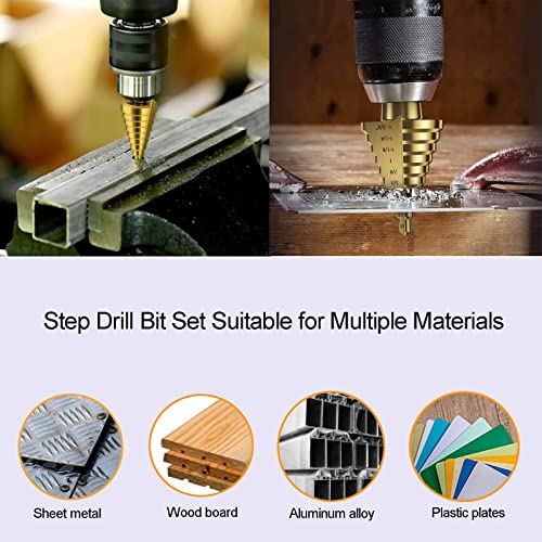- The step drill bit are made of high speed steel, strong and durable, fit for drilling holes in stainless steel sheet, aluminum alloy, plastic material and wood(the board must be smaller in thickness than the height of step drill bits, thickness not exceed 0.12 inch/3mm).