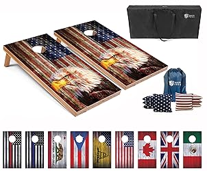 SOLID WOOD CONSTRUCTION – Our Regulation Size Boards measure 4ftx2ft and are constructed from 100% Premium Wood, exceeding all ACA Regulation Standards. They're ready to be played with out of the box and have a support cross bar to prevent bounce. Our boards are made with a Solid Wood Frame and a 1/2” Top Board are held together with Mitered Joints and Heavy-duty Hardware. Our boards are built to last! DIRECT PRINT DESIGN - The Flag Images are Printed Directly on our Boards. Never Worry about Vinyl Decals or Wraps Peeling or Tearing! Great for Tailgates, Barbeques, Parties, Weddings or just Backyard Fun and are sure to Provide Hours of Entertainment for the Whole Family! ADVANCED DESIGN – These Boards Weigh only 15 pounds each and are Easily Transported using our Carrying Case. 8 BEAN BAGS & CARRYING TOTE INCLUDED – Each Set comes with 8 Regulation Size Cornhole Bags (4 of each color). Bags Measure 6”x6” and are Filled with 15-16 ounces of Whole Kernel Corn. Made with Heavy Duty 12 oz Duck Canvas & Double Stitched for Extra Durability. TAILGATING PROS GUARANTEE – We will Replace Our Cornhole Bags in the case of Stitching Failure for One Year. Please Contact Us if you Experience any Issues with your Order!