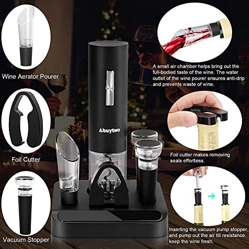 - All-In-One Gift Set: Abuytwo Automatic corkscrew wine opener set with base comes and a foil cutter to remove the wine seal easily, a wine aerator pourer and 2x vacuum stopper to keep the wine fresh for days.