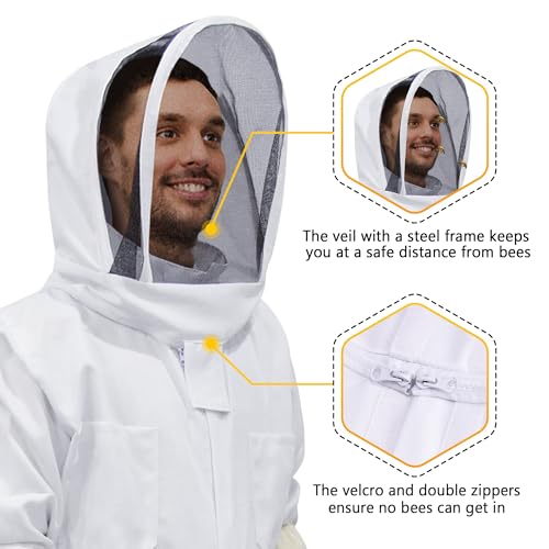 • Protección Integral— El traje de abeja para todo el cuerpo con velo autoportante desmontable redondo, las vistas frontales y laterales están abiertas. El traje de apicultor cubre desde la cabeza hasta los tobillos. Hay un cierre entre el sombrero y la ropa protectora, el velcro en la interfaz del cierre para asegurar que las abejas no puedan entrar.
