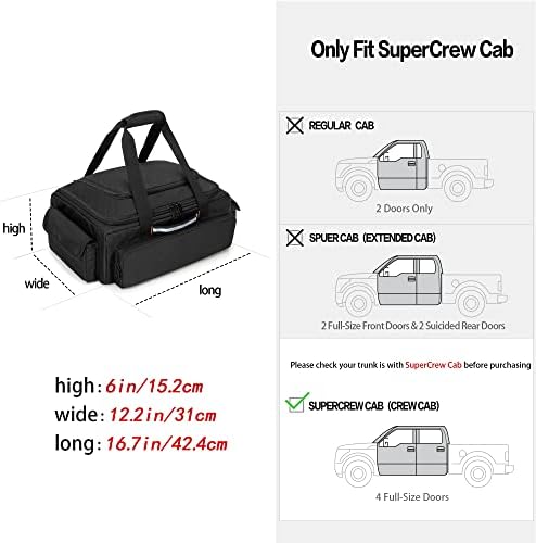 - Under Seat Storage: The truck storage size: 16.7 x 12.2 x 6 in, about 1/3 of the length of the back seat; please check whether your truck is with Crew or SuperCrew Cab (4 full-size doors) and measure the space under the rear seats before purchase