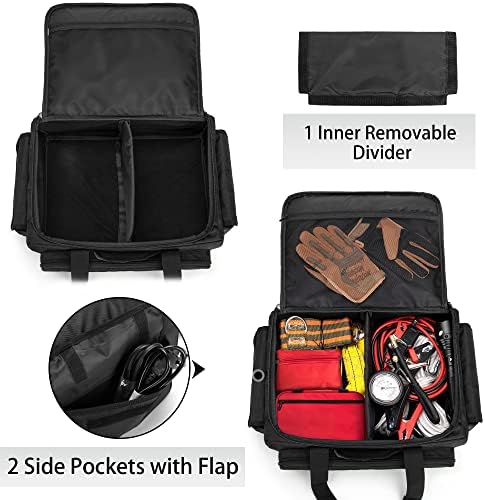 - Spacious Capacity: Inner detachable divider can divide the main space into 2 compartments, and easily store items such as first aid kits, recovery gear, flashlight, repair tools, or roadside assistance kits, etc