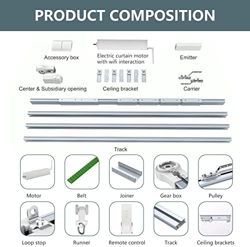 DescriptionSmart Curtain Rods Opener with 2.4G WiFi control by Phone with Tuya App Compatible with Alexa, Google Home, TMALL, Rokid, Dingdong, Xiaodu, Tencent yunxiaowei etc.Also supplied with 433MHz RF remote control with OPEN, STOP and CLOSECan pull up to 40-60kg curtain weight(depend on the length of the track)Open the curtain more than 10cm, the curtain will open or close automaticallySuitable for straight windows as well as curved windowsOpen and close the window curtain by WiFi control by Smart Phone, Bluetooth Speakers or RF remote controlStop at any prefers position via smart phone, Bluetooth speakers or remoteOver loading protectionCan be operated by hand while power offInstallation is very easy for everyoneSmart limit detection by saving the open and close positionsAutomatic stop in seconds when the curtain is fully opened or closedSpecificationVoltage: AC 110VWiFi: 2.4G (WIFi name without Chinese Character in it)Rated Wattage: 45WRotate Speed: 110rpmSpeed: 10cm/sTorque: 1.5NRated Current: 0.3AInsulation Class: E classProtection Level: IP41Material: PC/ABSApplicationSuitable for straight windows as well as curved windowsGreat for replacement of traditional curtain/drapery tracks/rails. You can even re-use your existing curtains.Package Content1× AC 110V Smart Motor with US 10' PLUG1×RemoteRunnerDrive UnitLoop StopperCurtain TracksCeilling Mounting BracketsCurtain Gliders1×Srew Driver9×Screw1×User Manual
