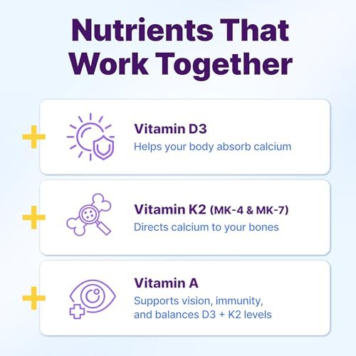 - Synergistic ADK Blend, Innovix Vitamin D3 K2 capsules contain Vitamin D3 5000IU, 600mcg Vitamin K2 MK7 and MK4, and Vitamin A 3000 IU that work together to help enhance calcium regulation, deliver immune support, and improve bone health