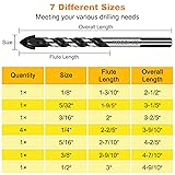 HIGH QUALITY DRILL BIT SET; TITGGI Masonry drill bit set, industrial strength carbide drill bit tip, excellent abrasion resistance, make the drilling much more easier. this cement drill bits can easily penetrate various material (glass, ceramic, cement, wood, brick, travertine, hard plastic, etc.) FAST PENETRATION; This masonry bit is suitable for most general drill, electric drill, hand drill and bench drill, the double U-type groove slot design brings fast drilling dust remove, and 3-flats shank allows drill bit easy plug and to be held tightly, strong tungsten carbide drill bit tip and longer service life of TITGGI masonry drill bit. SATISFY ALL YOU DEMAND; Package includes 10 Pcs drill bit set: 1/8", 5/32", 3/16", 1/4", 1/4", 1/4", 1/4", 5/16", 3/8", 1/2", there are 10 differenct cement drill bit sizes, that will help in drilling by starting with the smallest bit and continuing to the size needed. PROFESSIONAL MASONRY BIT, WIDELY USED; TITGGI masonry drill bits, ideal for drilling fastner holes in bathroom tiles, ceramic drill bits for pots, or wall mirrors, can easily drill holes on tile, concrete, brick, glass, ceramic, wood, and reduces breakout, please cooling with water and control the speed when drilling. WORRY FREE! For genuine masonry drill bit, please identify TITGGI brand concrete drill bit set, international tool brands with guaranteed quality. If you're not satisfied with our Drill Bit Set, we will offer you premium customer service! Feel free to ORDER NOW!