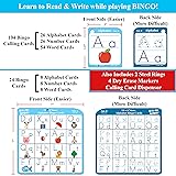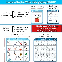 【Claim the square by Writing on it!】 – In order to claim your BINGO square, trace the letter, number or word onto your BINGO sheet. By repeatedly writing these letters, numbers and words, it ensures a complete mastery of the concepts. Double Sided cards provide 2 levels of difficulty. 【Use as Flash Cards】 – Using the included steel binder rings, transform the bingo cards into Flash Cards. The Flash Cards are a good way to familiarize yourself with the concepts 【Letters, Numbers & Words】 – There are 24 Game Cards and 104 Calling Cards that can be used also as flash cards. 【Highest Quality】 – Every beautifully colored card is writable and erasable. Cards are made from the highest quality durable, sturdy. water & stain resistant art card paper. Lamination allows the writings to be wiped clean and rewritten repeatedly.