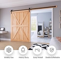 Barn Door Hardware Kit: High quality aluminium, fine black powder coated surface,anti-corrosion ensures years of beauty and longevity.Slide Like Butter ,Ball bearing roller slide smoothly and quietly,Tested Beyond 100,000 Rolls.All items have been multiple inspected before on market. Widely Apply: Our hardware suitable for both modern and rustic style,you can apply for aisle,garage,kitchen,bedroom and so on. Reminds: Fit up to 54" Wide Door;Fit Door Thickness 1-3/8" ~ 1-3/4"(35~45mm);Door Weight Capacity 220lbs. Package Includes:(2)4.5ft Rail,(7)Spacer,(2)Rollers,(2)Door Stops,(1)Floor Guide,(1)Track Connector.NOT INCLUDE DOOR Easy Install: We provide step-by-step graphic & text installation parsing manual,you can also get soft online copy and professional installation guide from our online service. 24 Hours Stand By: EaseLife specialize in sliding door and hardware many years,if there anything missed or broken,pls let us know,we are whole day online to solve your problem.