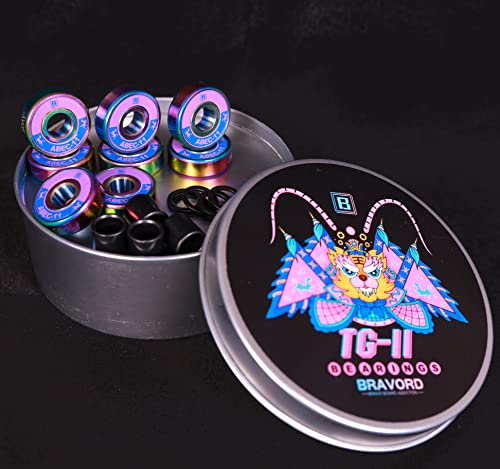 - DESIGN OF BEARINGS: TG11-Tiger, which symbolized speed, power, and flexibility. By carbonization of the totem tiger, the BRAVORD designer combines violet and sky blue on the rubber shield, and the two-color combination is traditional Chinese color schemes. And these two colors are perfectly fit to TG-11 dazzling color chrome steels, which you might see different color effects during highly-spinning in various environments, day or night
